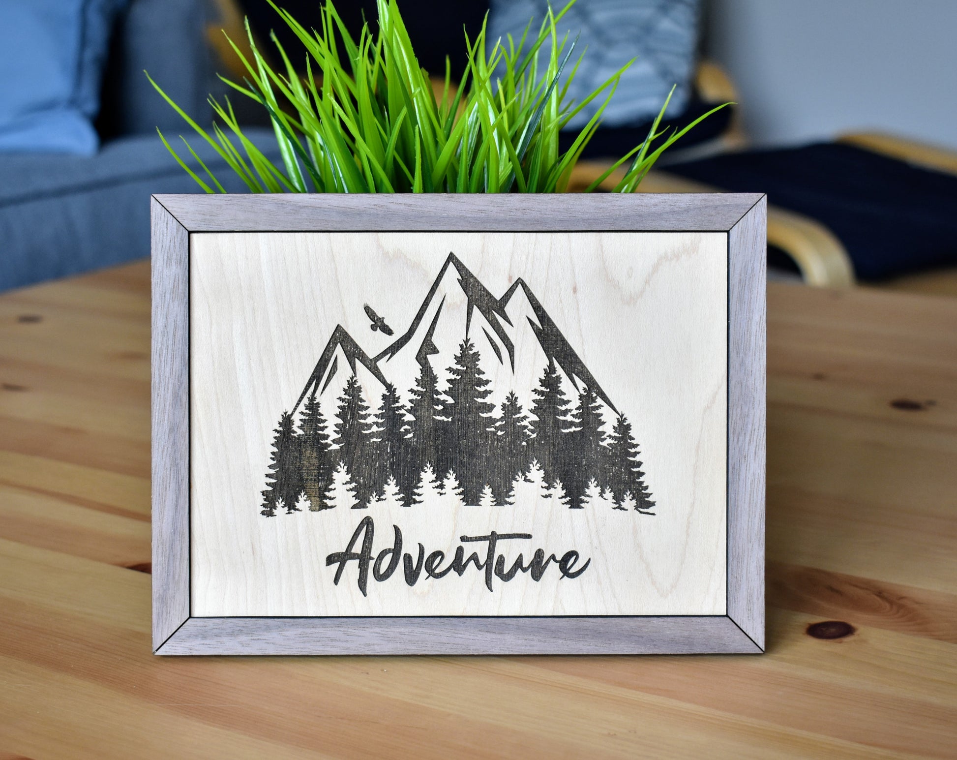 Beautiful decor sign made of high-quality maple plywood that is carefully laser engraved with our own Adventure and Nature-inspired art design. The sign is nicely finished with a walnut frame. A mounting hole is provided for quick and easy installation.