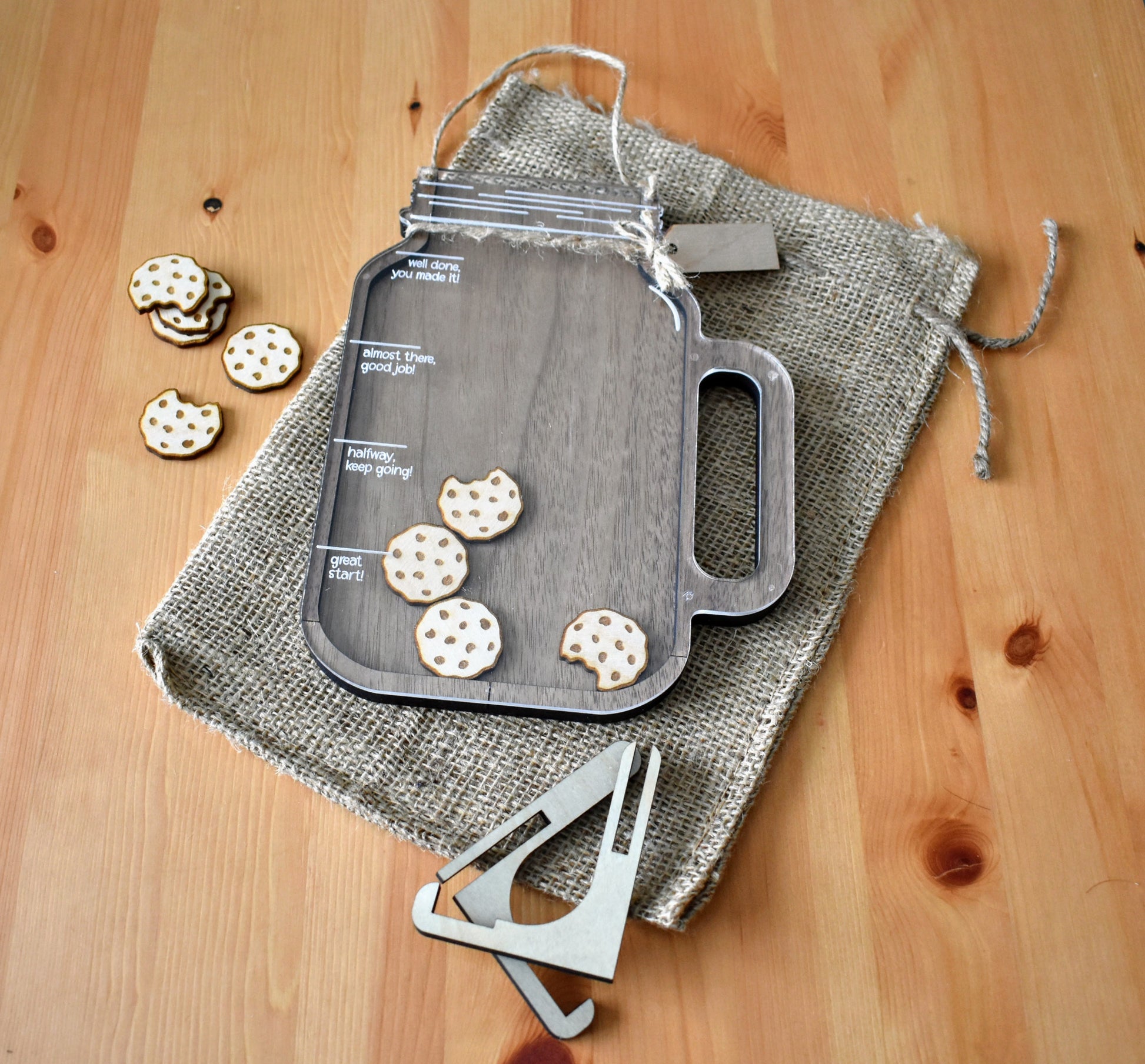 Gorgeous reward jar for your little ones. This is a fun way to encourage them to do their chores, homework, and good behaviour in general. Made of high-quality Walnut and transparent acrylic cut and engraved with a high-precision laser. You can select between two jar design models as well as get the tag engraved. You can display it using the included stand, or hang it on the wall or door. It comes with 22 cookie tokens and you can choose between whole or bitten options. A nice Burlap bag is included for you to store everything or keep the tokens while in use.