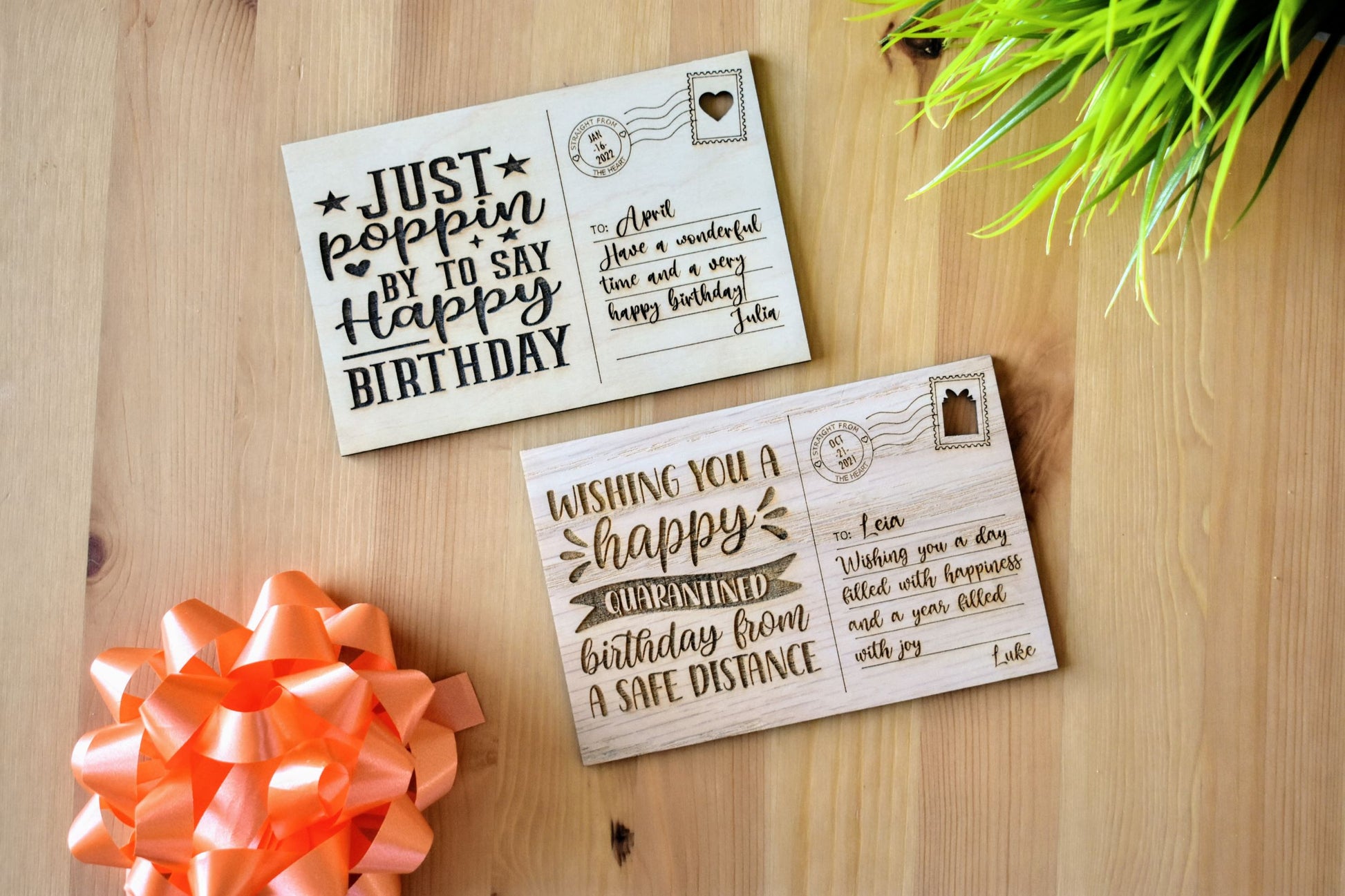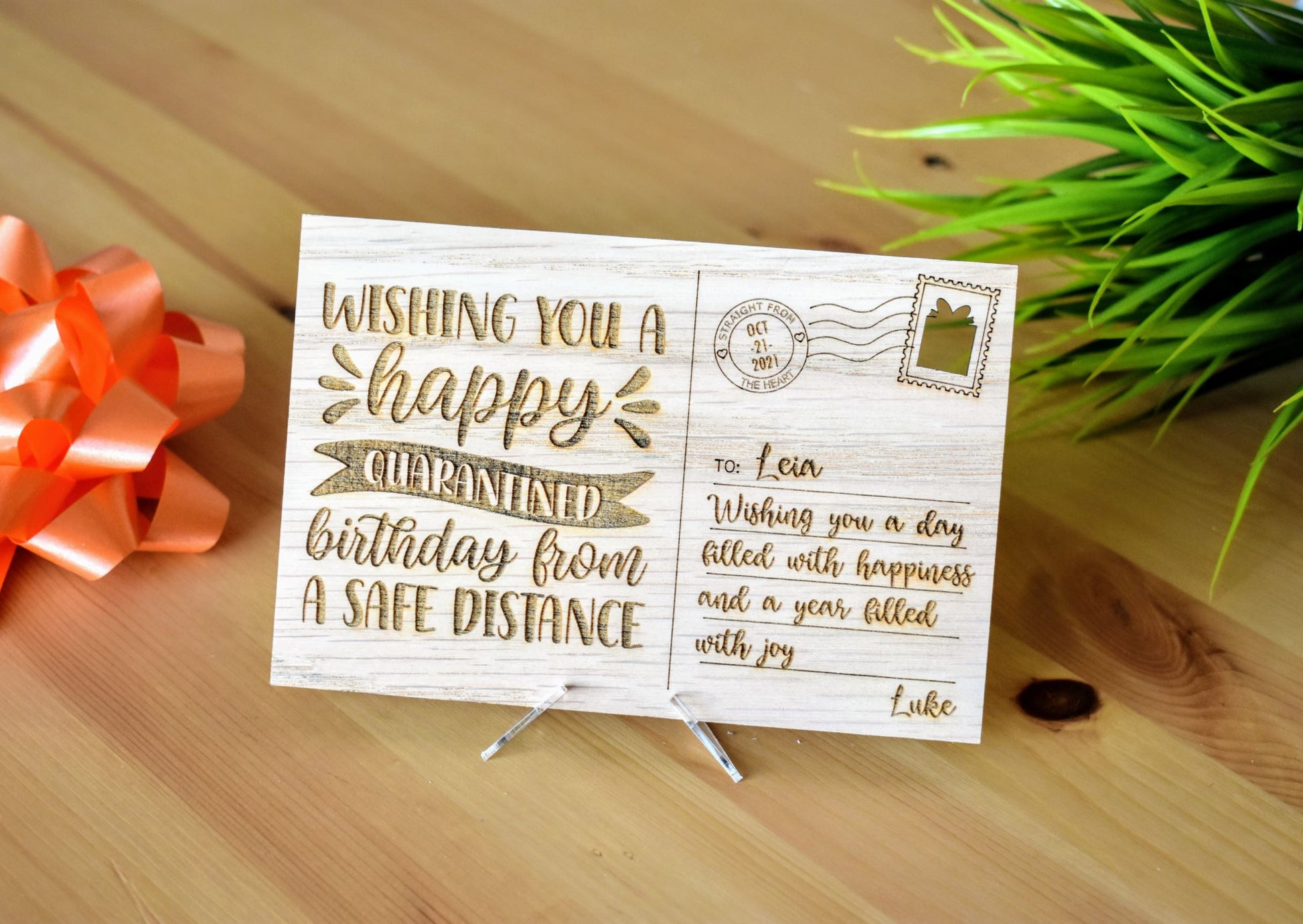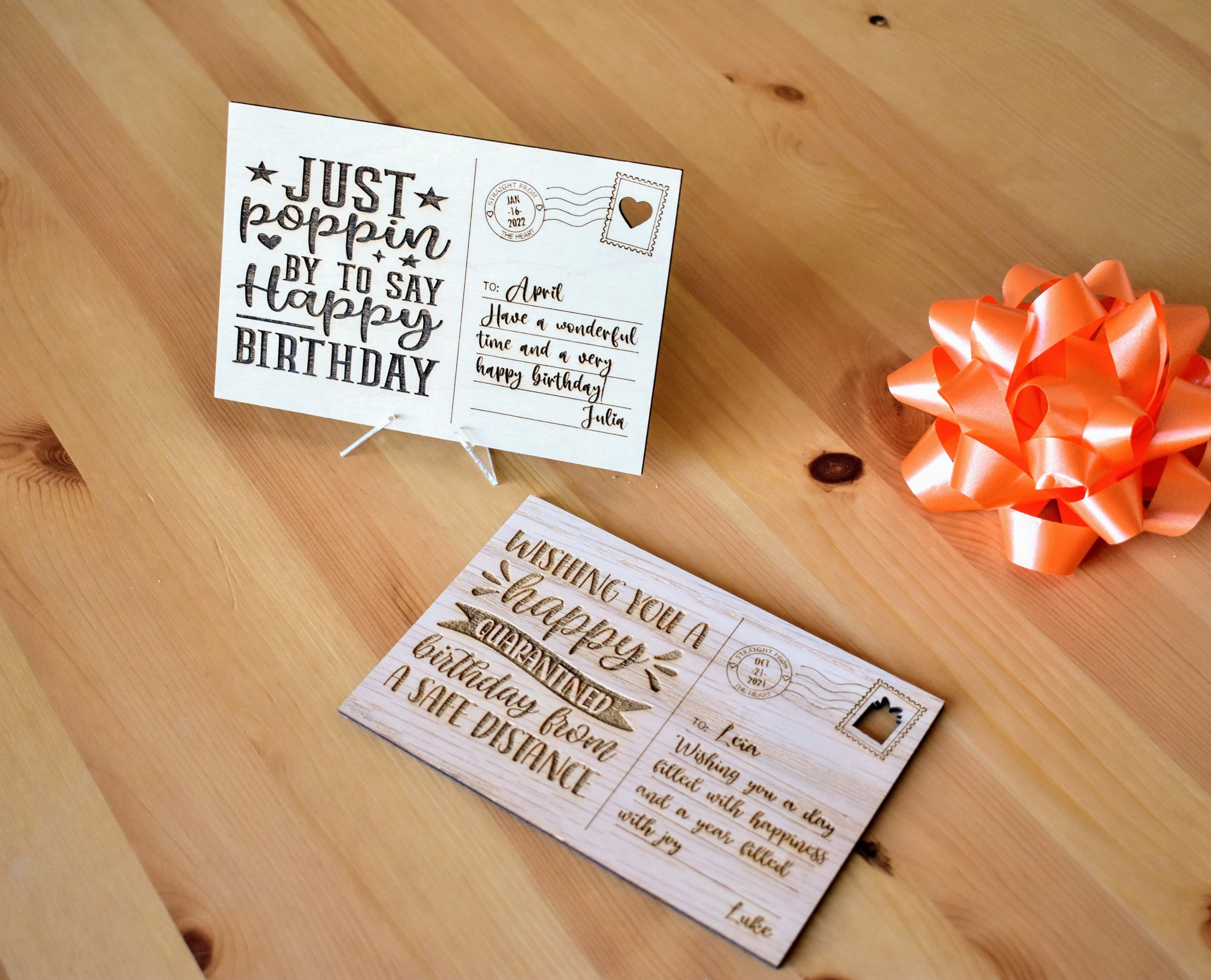 Gift this beautifully engraved personalized wooden postcard to that special person for their birthday. A beautiful design that allows you to customize all aspects of the card and make it unique. The postcards are made of high-quality 1/8" plywood, and you can choose from 3 different materials (Baltic Birch, Red Oak, and Maple). The designs are laser engraved for a beautiful and clean finish. A transparent acrylic stand/holder for display is included.