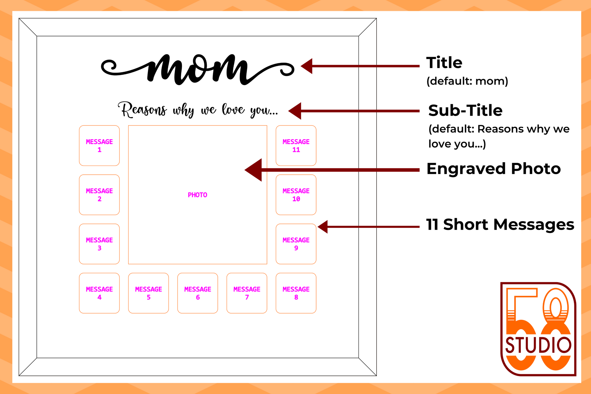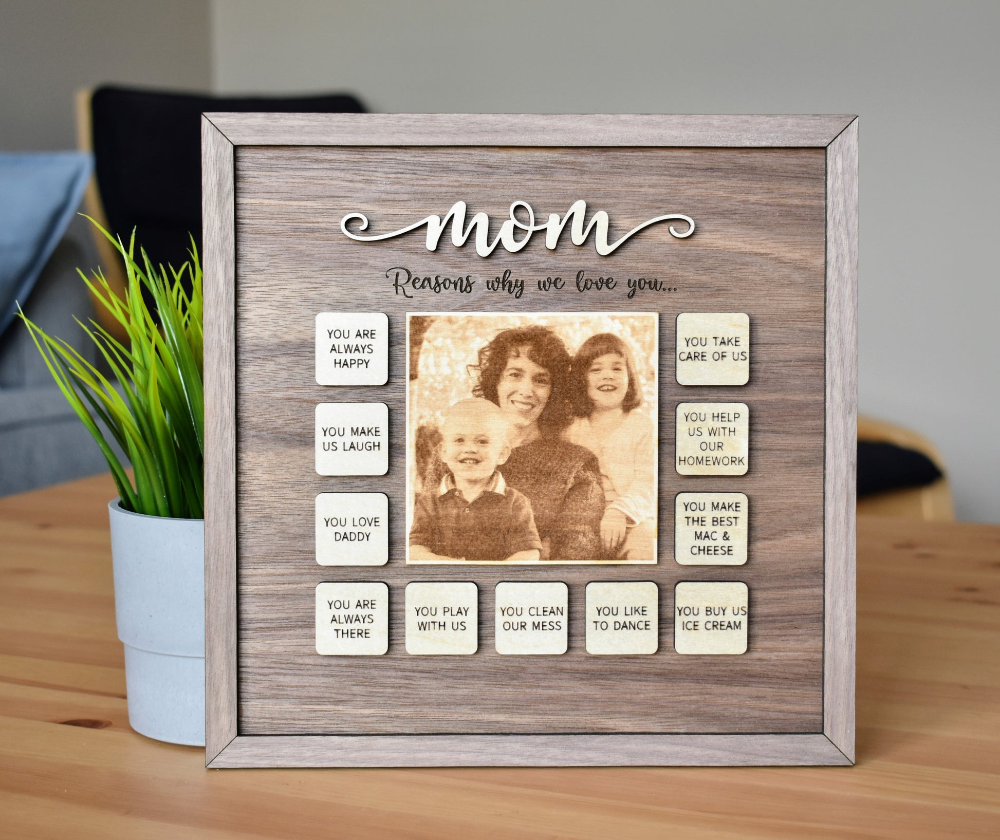 Surprise mom with this gorgeous wooden portrait and let her know a few reasons why you love her so much. Fully customizable with a photo, 11 short messages, and title and sub-title. Featuring a multi-layer assembly of high-quality walnut and birch plywood that is carefully laser cut and engraved. This makes for a perfect personalized gift for mom.