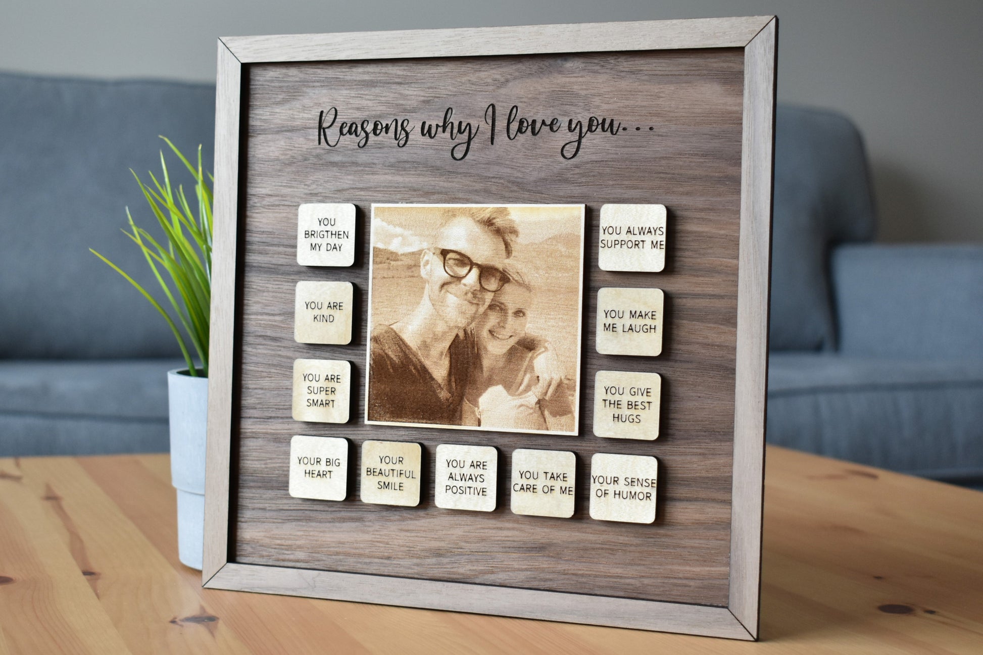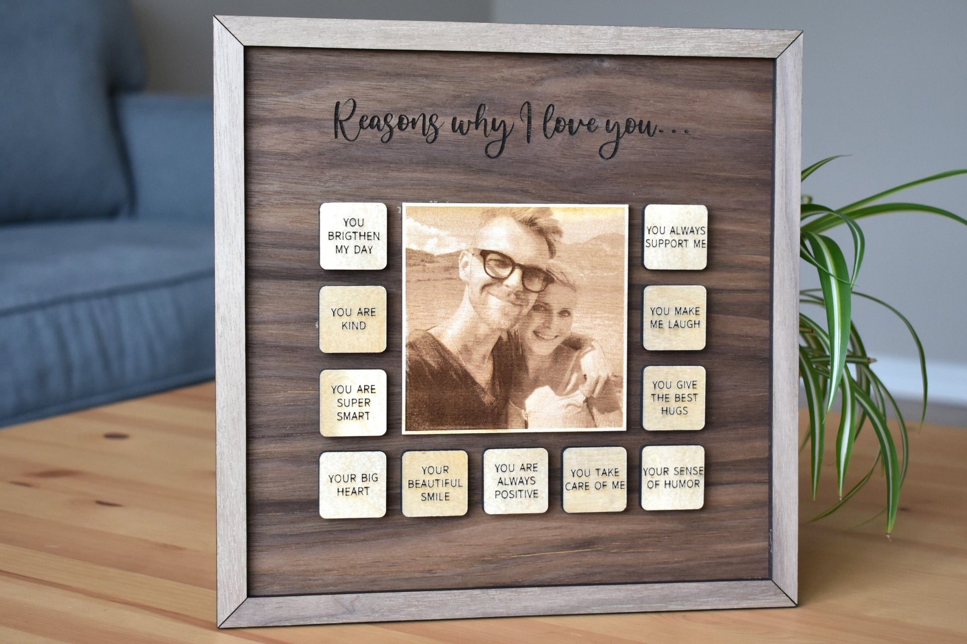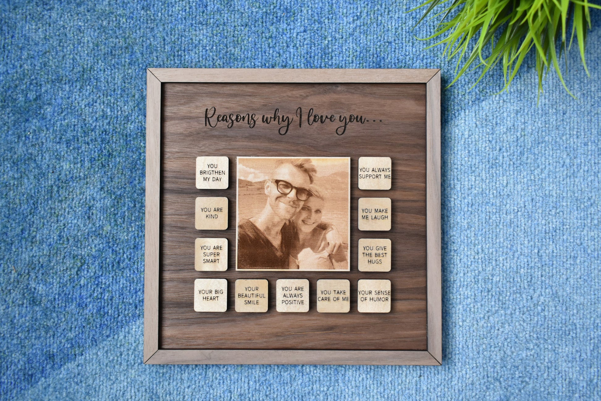 Surprise your loved one(s) with this beautiful wooden portrait and let them know a few of the reasons why you love them so much. Fully customizable with a photo, 11 short messages, and a title. Featuring a multi-layer assembly of high-quality walnut and birch plywood that is carefully laser cut and engraved. This makes for a perfect personalized and thoughtful gift.
