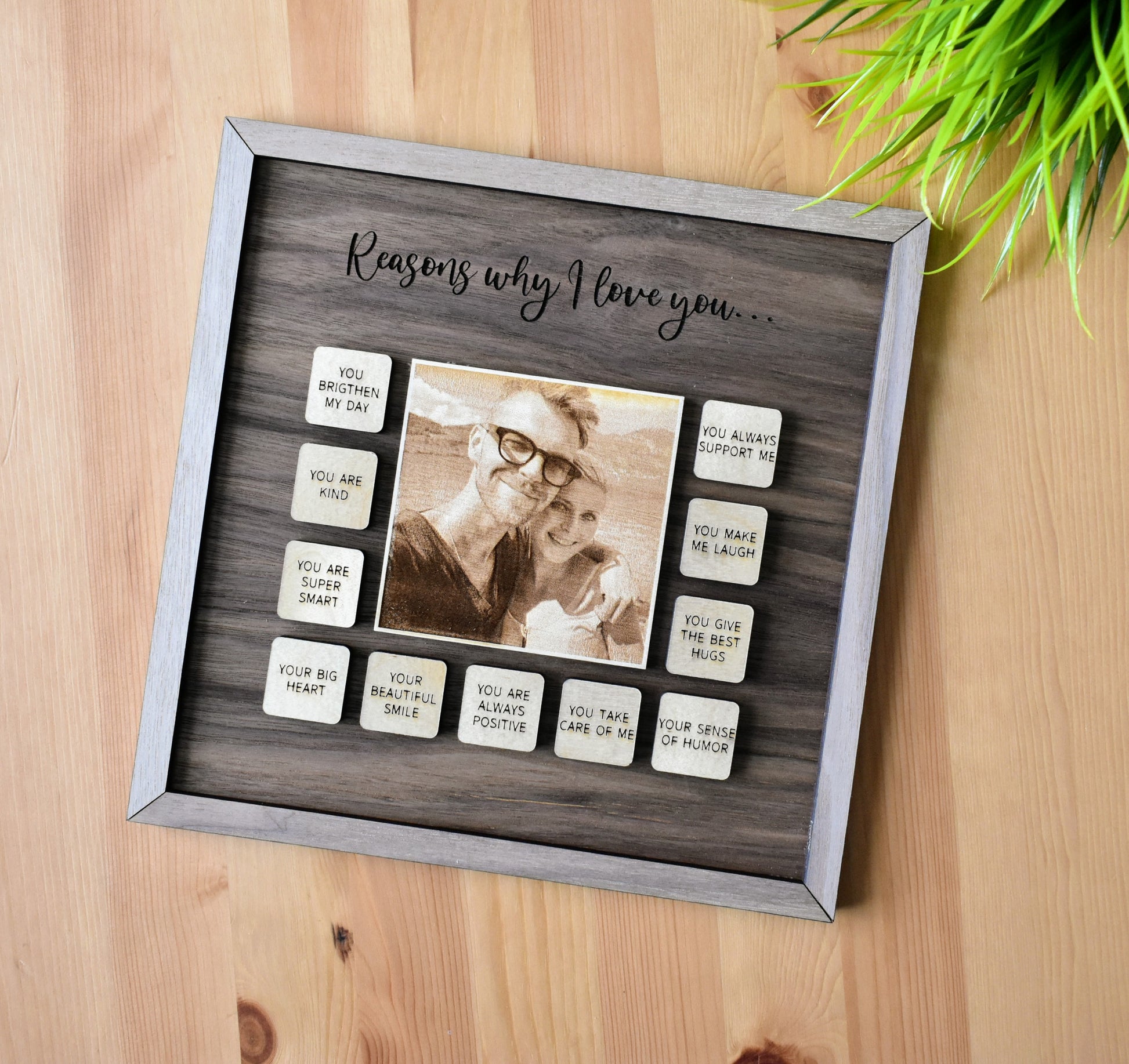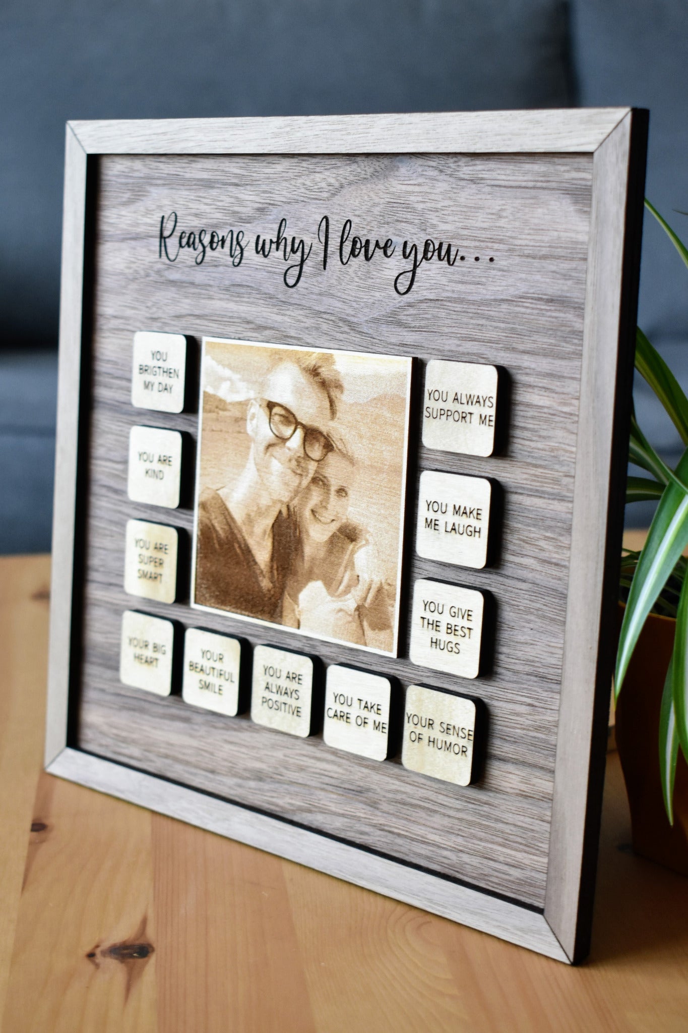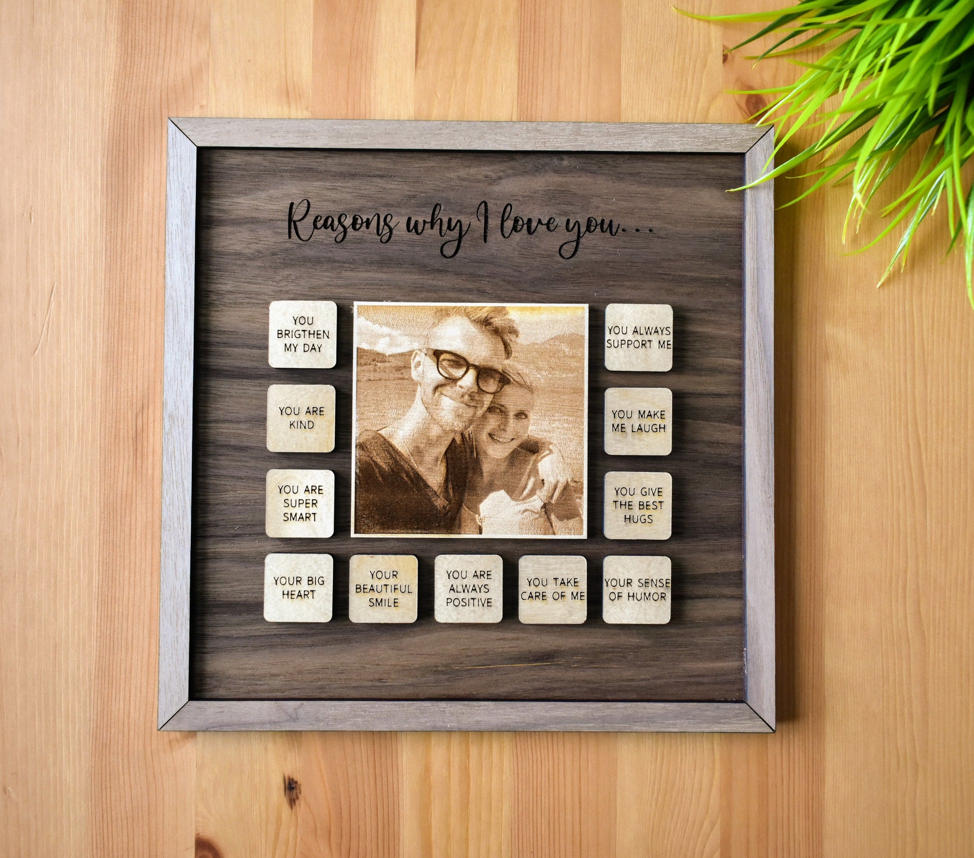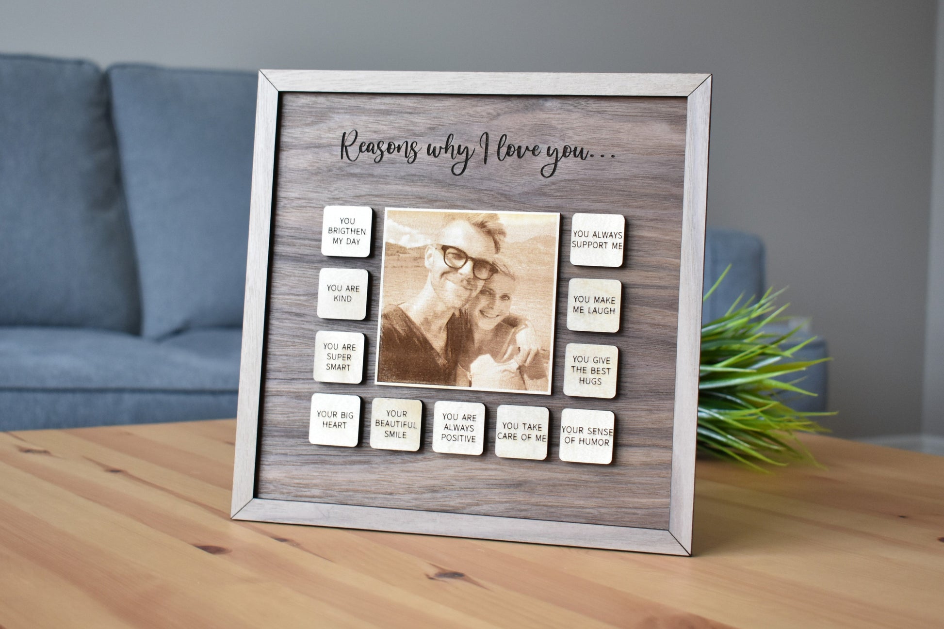 Surprise your loved one(s) with this beautiful wooden portrait and let them know a few of the reasons why you love them so much. Fully customizable with a photo, 11 short messages, and a title. Featuring a multi-layer assembly of high-quality walnut and birch plywood that is carefully laser cut and engraved. This makes for a perfect personalized and thoughtful gift.