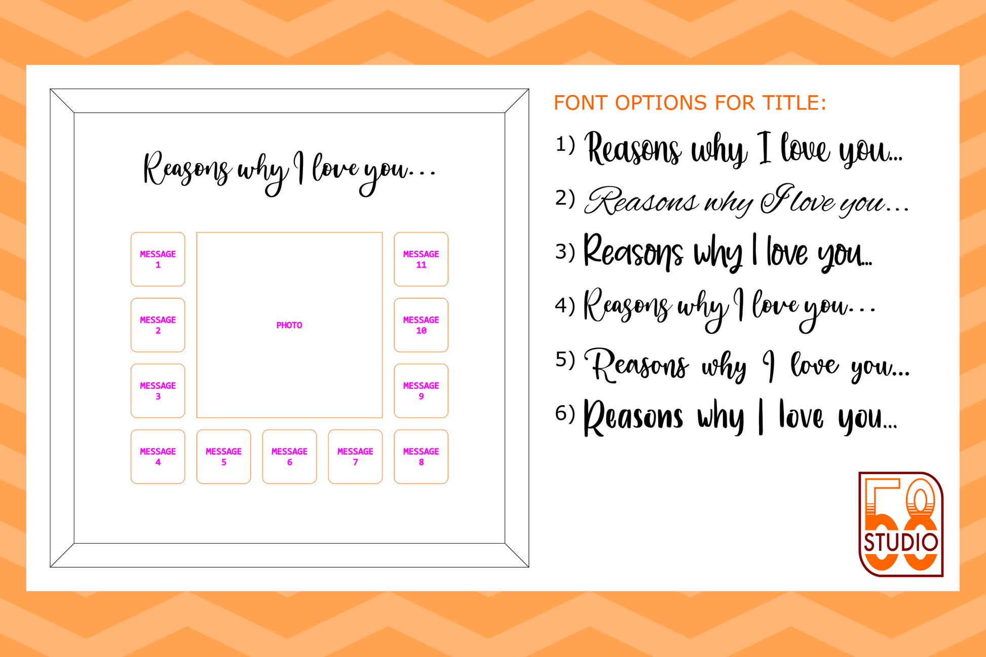 1. Title, if different from the sample pictures (leave blank for default "Reason Why I Love You...").