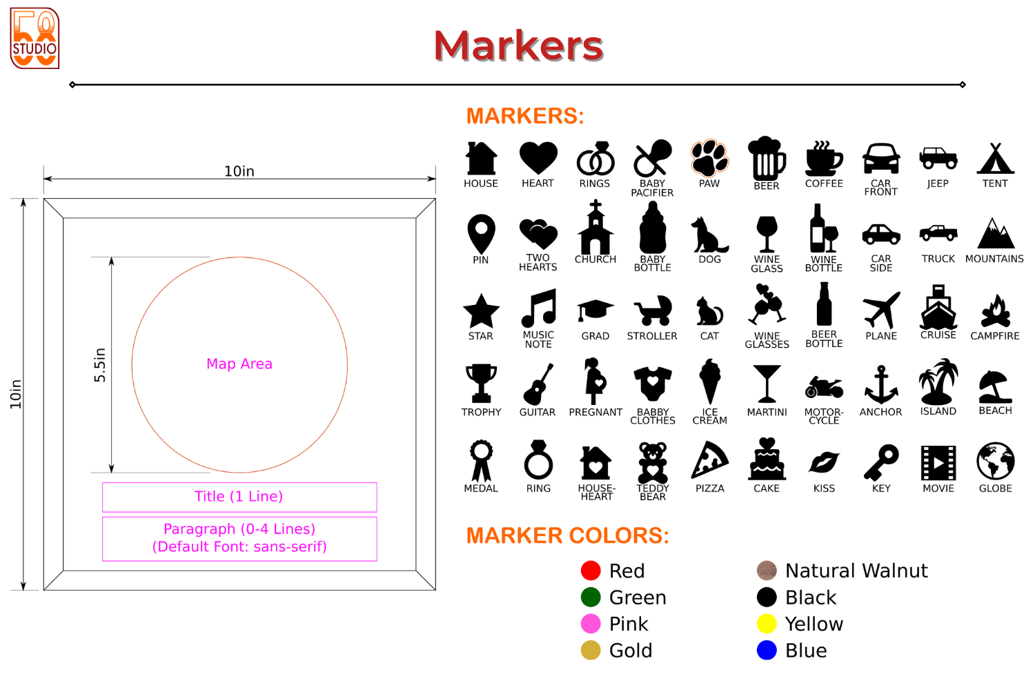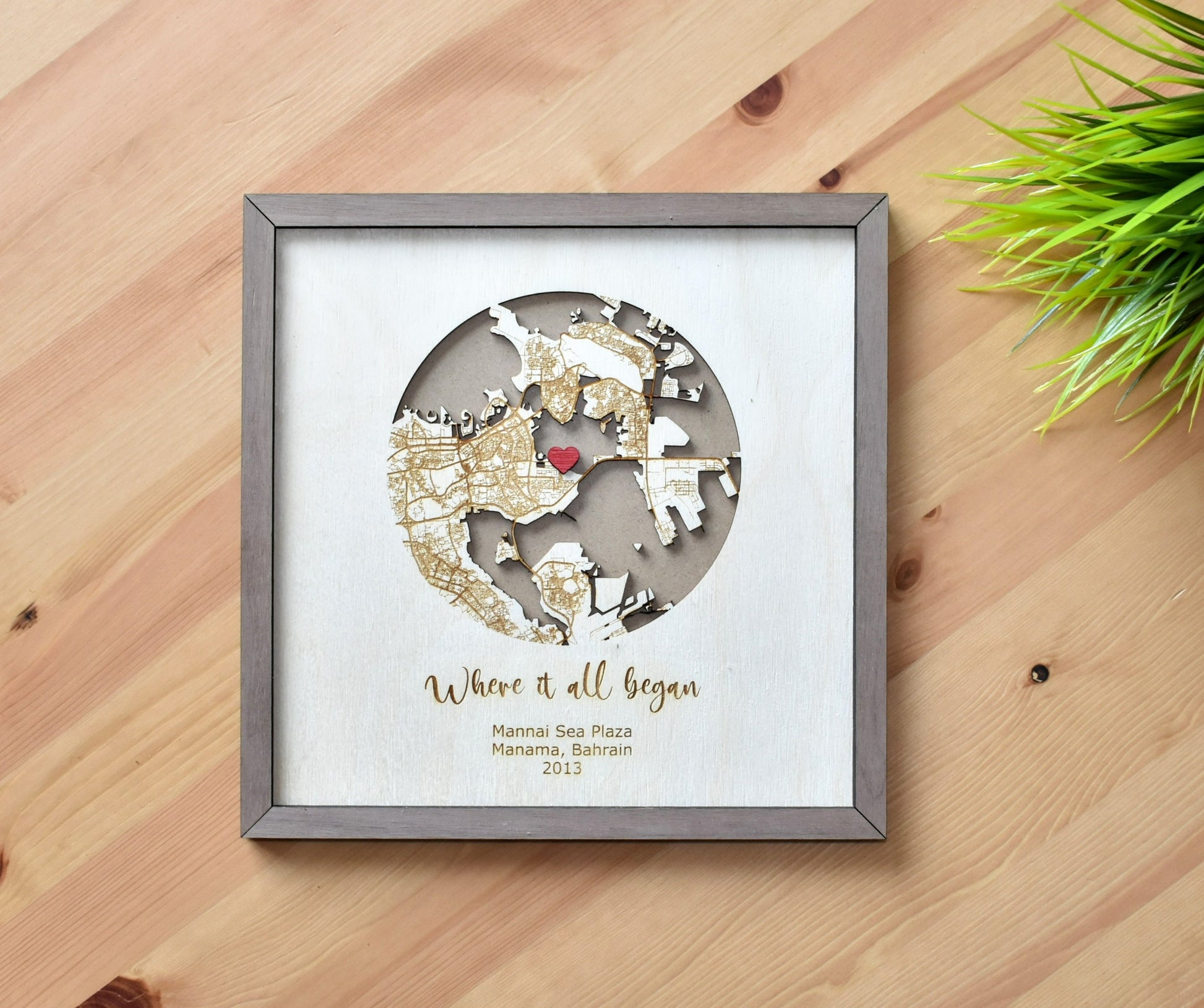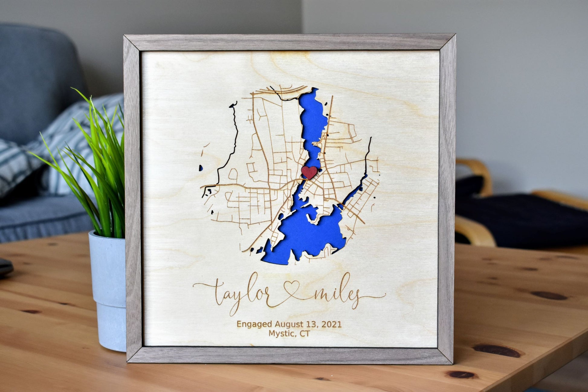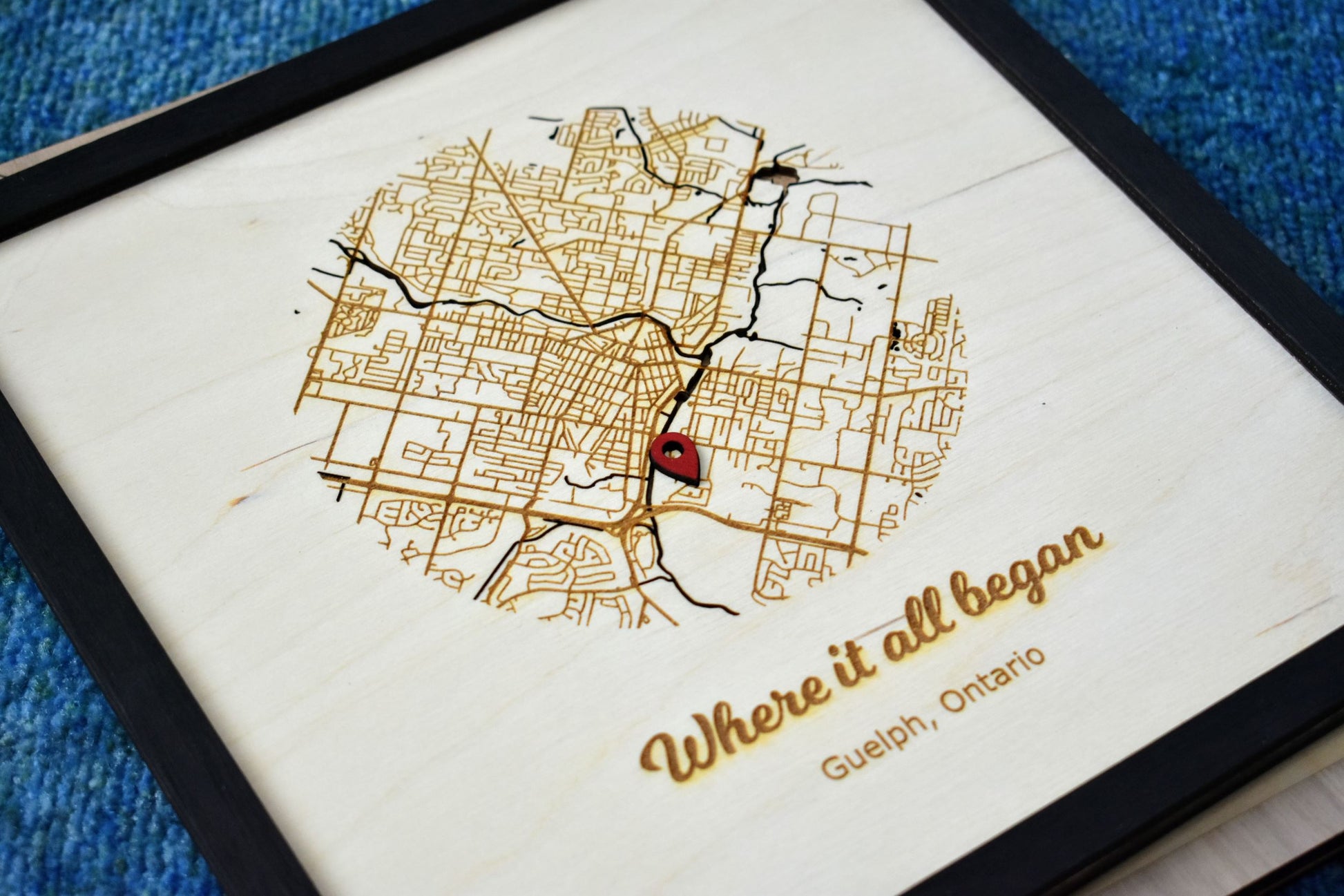 Beautifully crafted engraved map for celebrating special life moments, memories, and the places where they happened. This custom map is made of high-quality Baltic Birch plywood that is engraved and cut with a high-precision laser. The roads are engraved and any water body on the map is cut, resulting in an amazing-looking 2-layer map. You can choose from several font styles, marker options, and marker colors. You can also get the frame and water layer in different colors. A mounting hole is provided on the back for easy hanging, as well as a pair of feet for standup display.