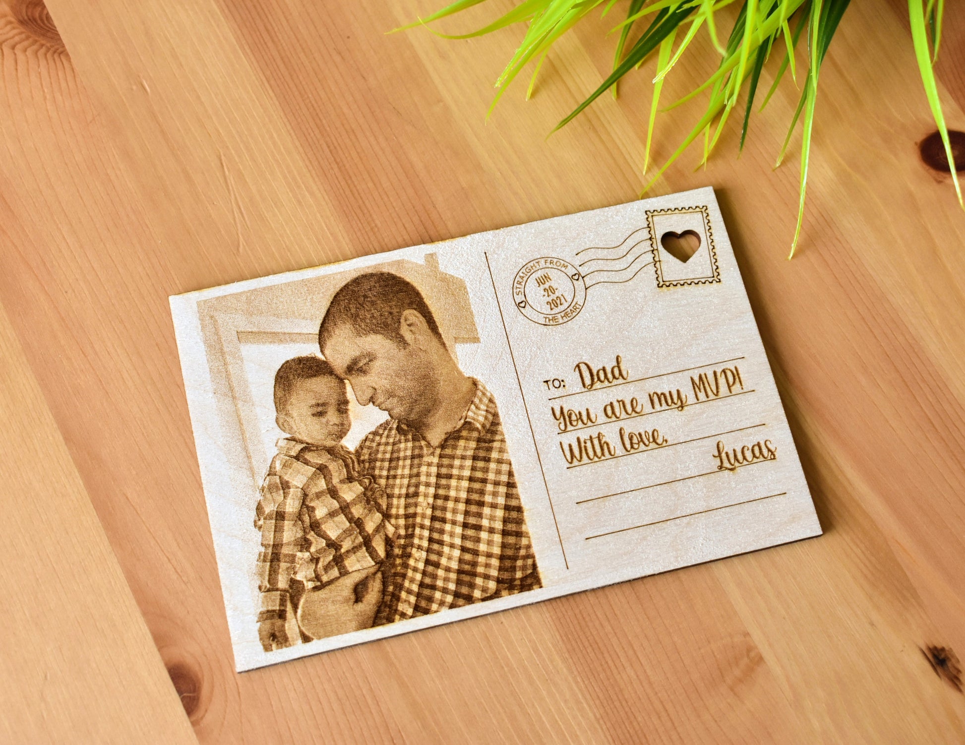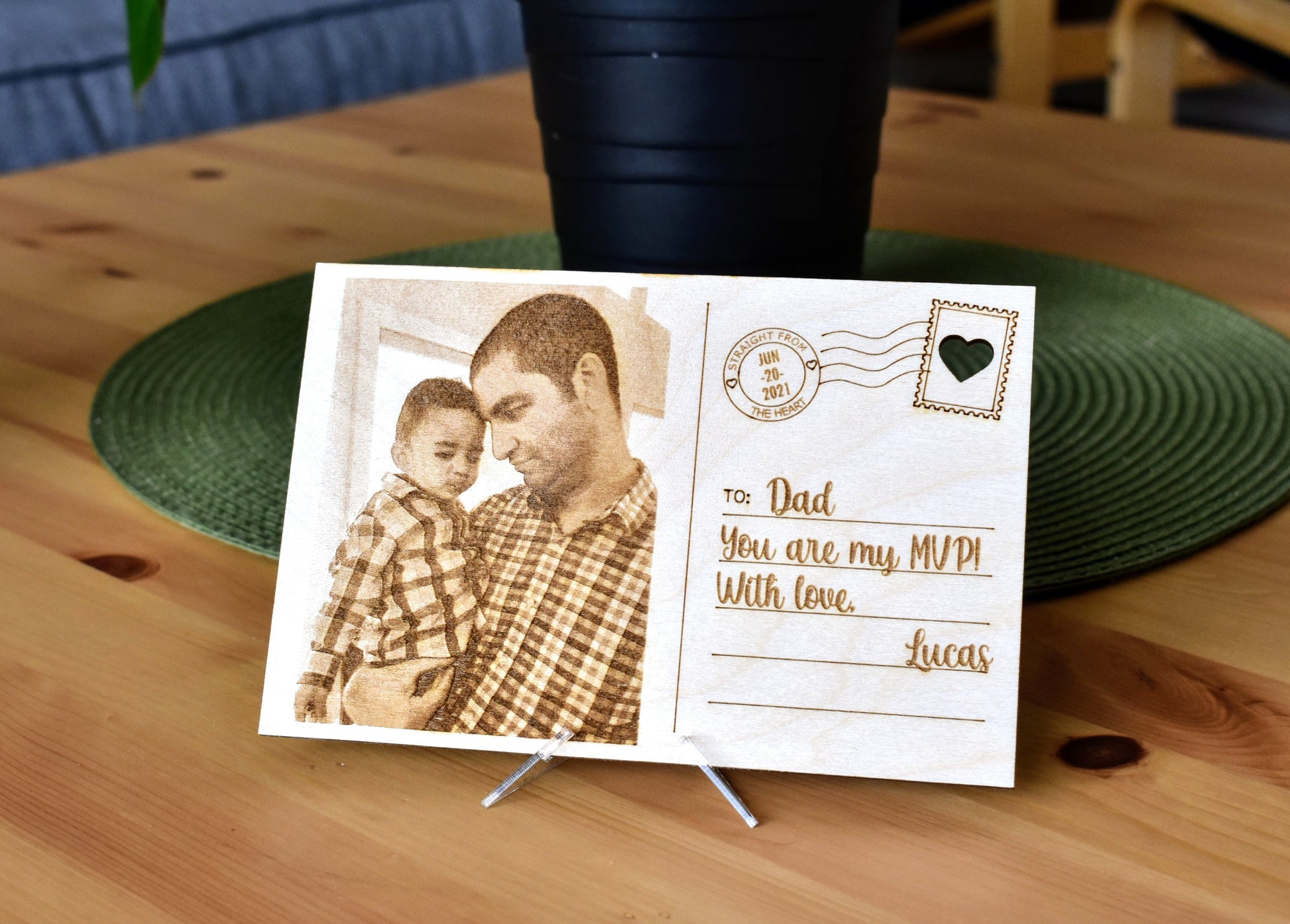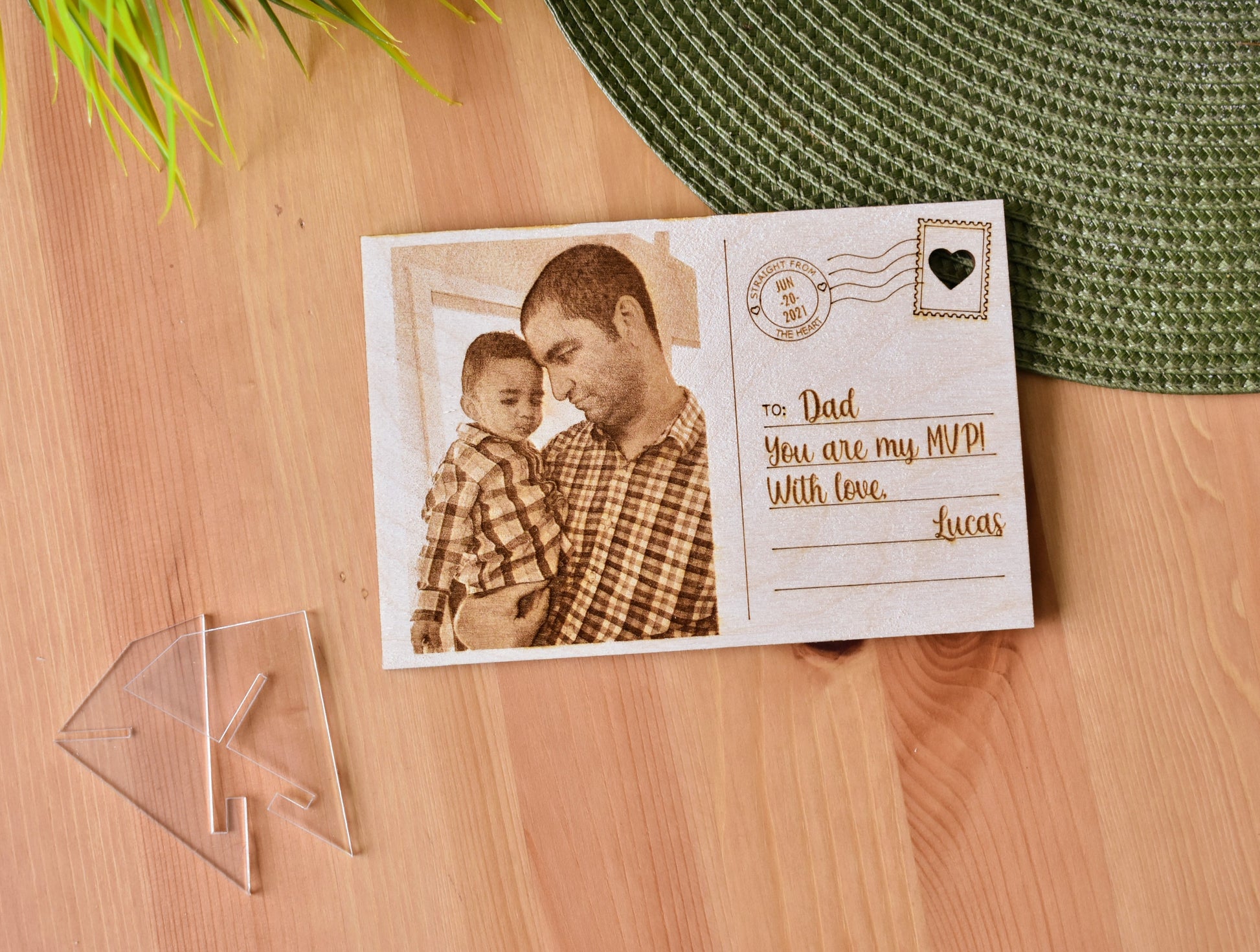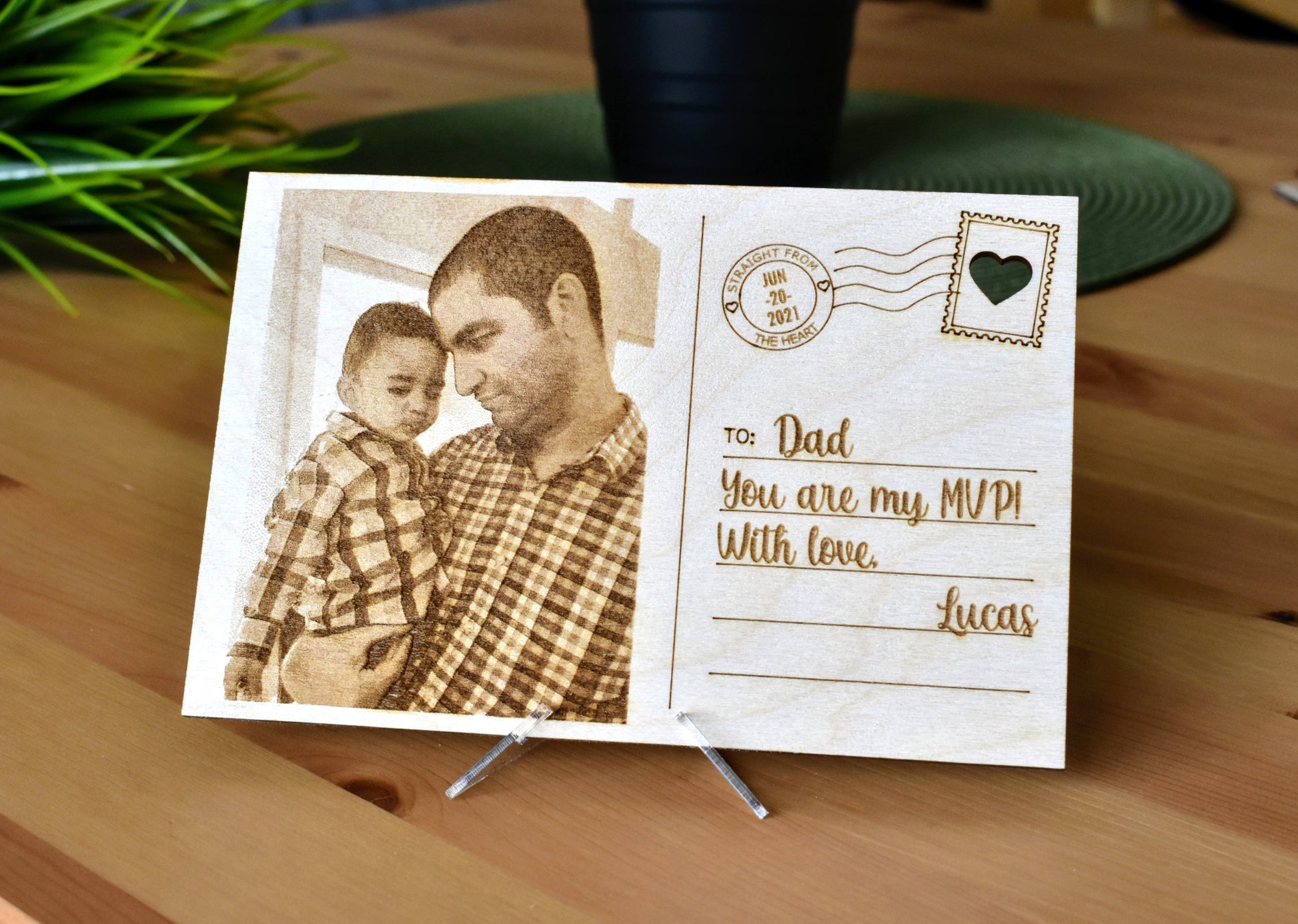 Gift this fantastic personalized wooden postcard to someone special, no matter the occasion. Made of high-quality 1/8" Baltic Birch plywood that is carefully and precisely engraved with a photo of your choosing, and a beautiful design that allows you to customize all aspects of the card and make it unique. Father's Day, Mother's Day, Birthdays, Graduation, you name it. This fully personalized portrait wooden postcard makes a beautiful and original gift. A transparent acrylic stand/holder for display is included.