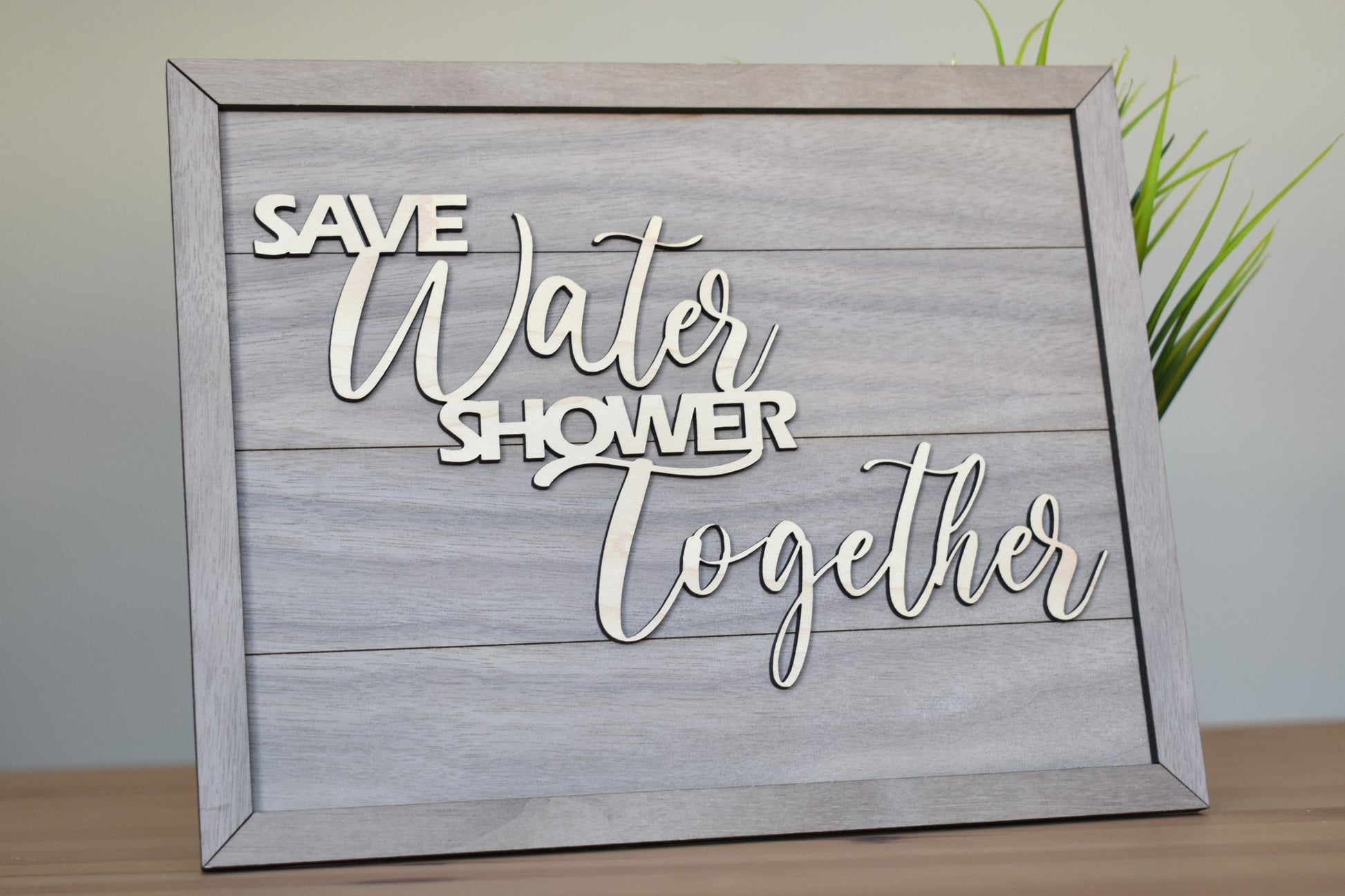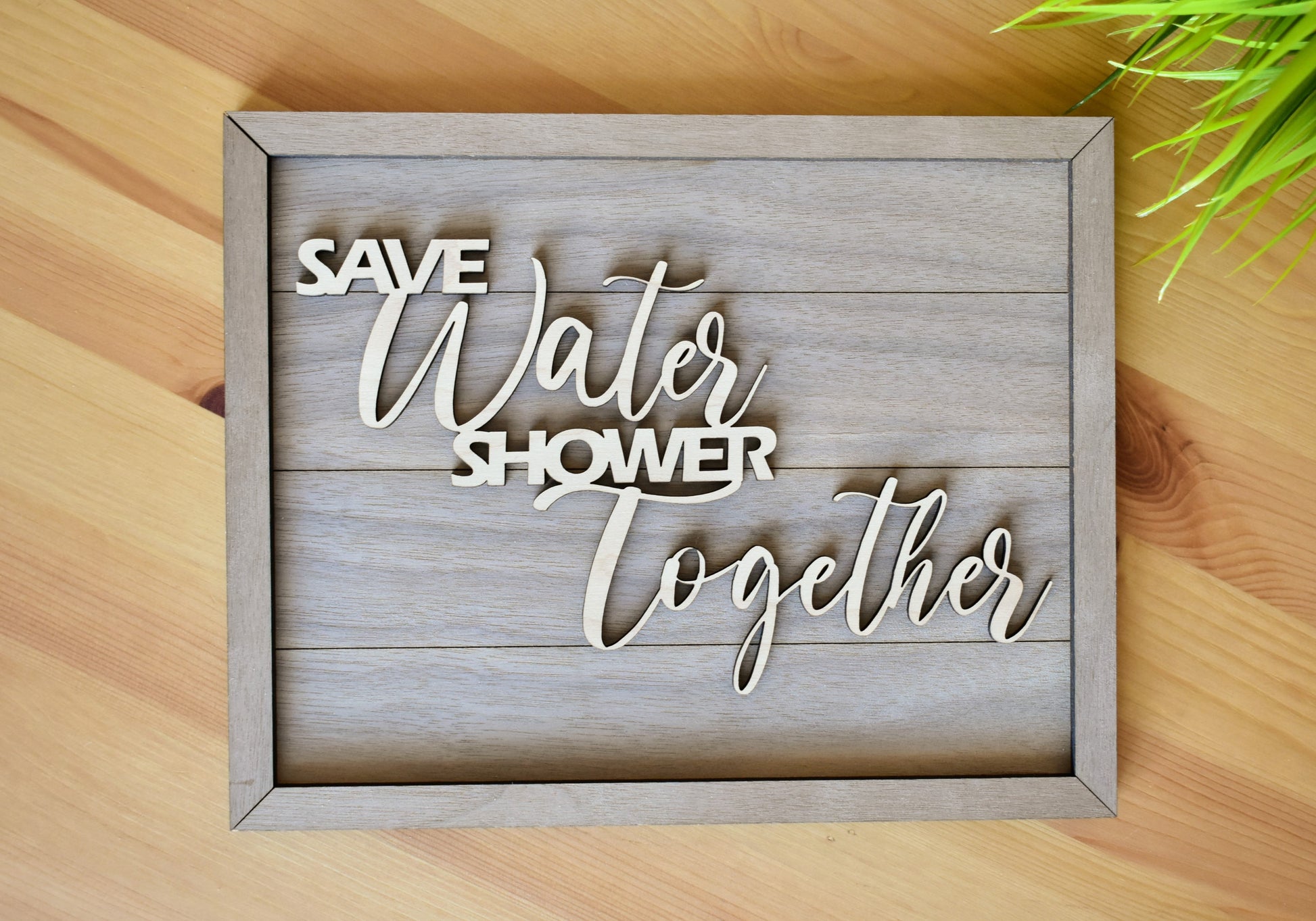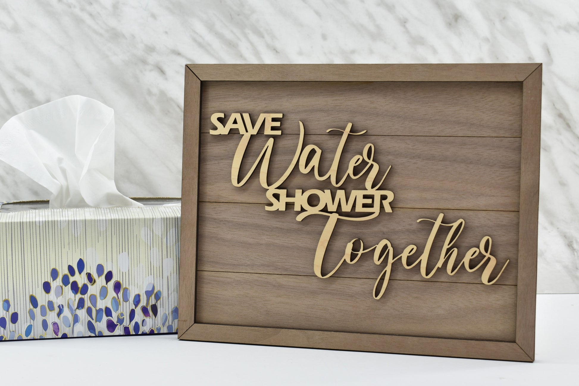 Beautiful and funny wooden decor sign made of high-quality plywood with the text "Save Water Shower Together". The sign is carefully crafted using a walnut background nicely finished with a walnut frame, and raised script lettering that is laser cut in maple. A mounting hole is provided for quick and easy installation.