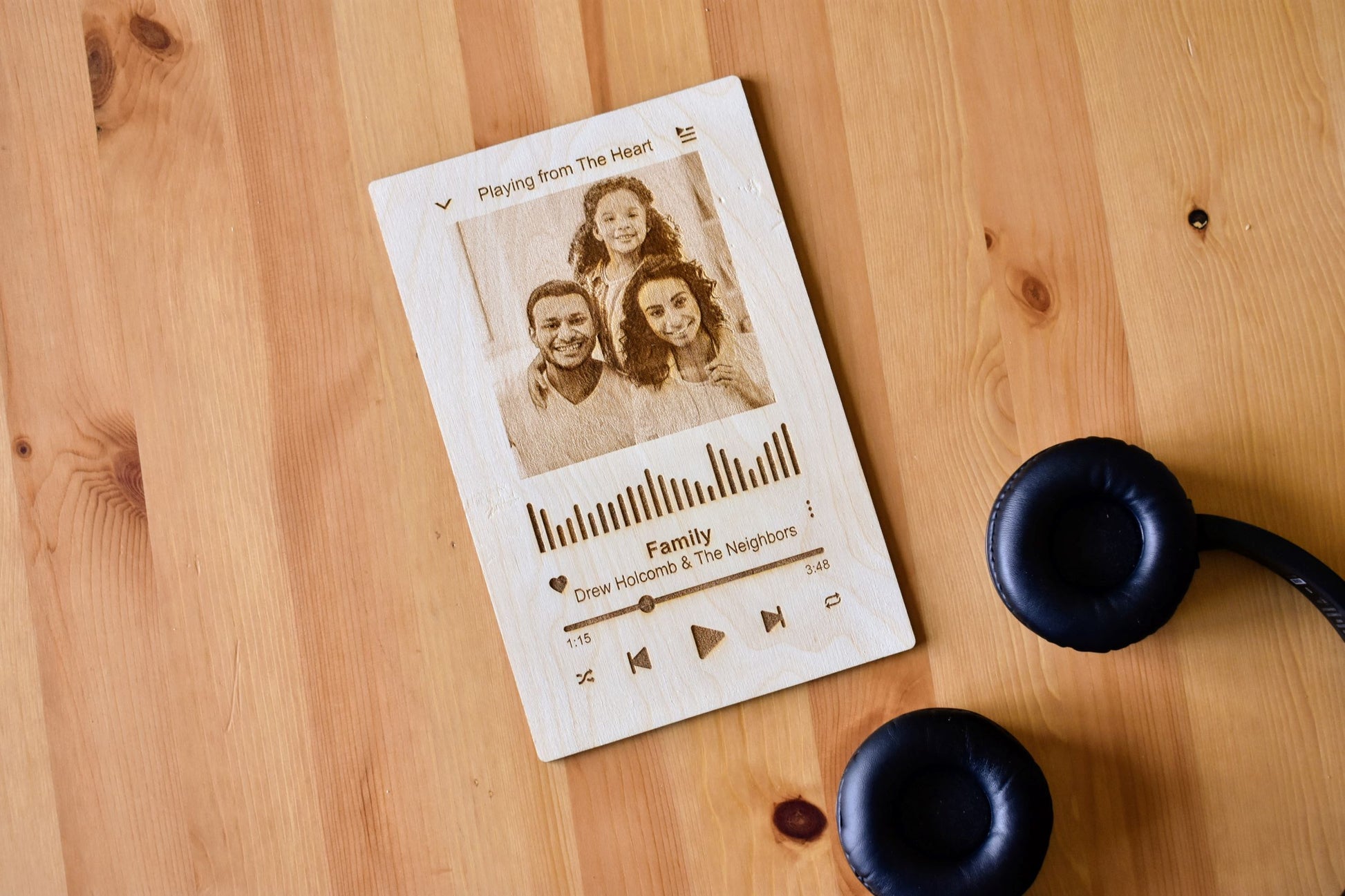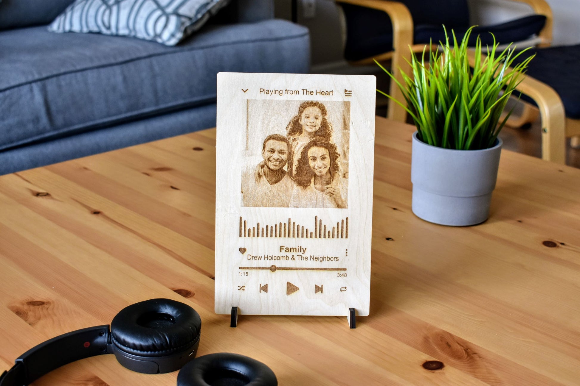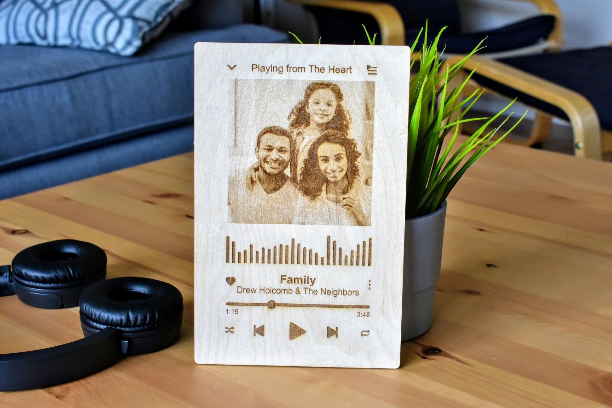 Give us your favorite song and a photo and we will create this beautiful wooden musical-themed portrait plaque, engraved with your photo, as well as song name and artist in a music player style design. Made in high-quality 1/8" Baltic Birch plywood, and carefully laser engraved with a high level of detail, this plaque makes for a perfect personalized gift to yourself or to your loved ones. Celebrate memories and the way we connect through music. Use the two stand feet (included) to display your unique and beautiful custom décor on a desk or table, or use wall adhesive mounts (not included) to put it on the wall. Either way, we guarantee it will catch the attention of anyone who looks at it.