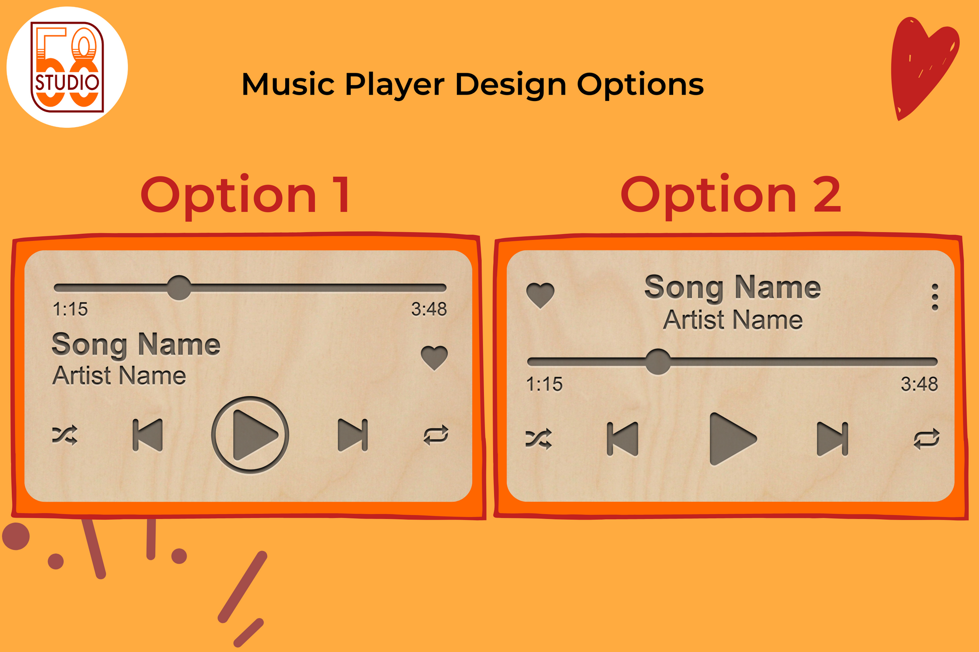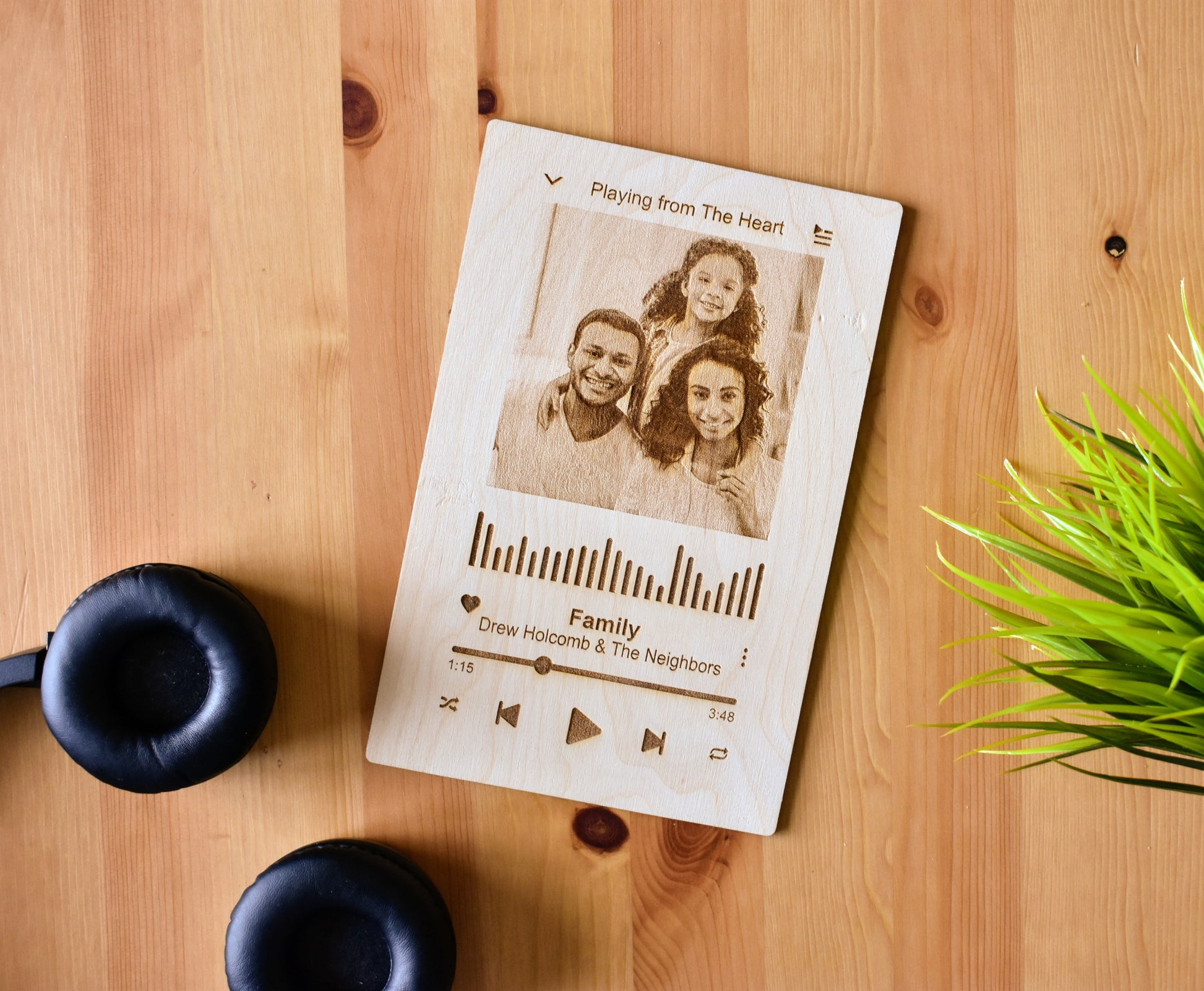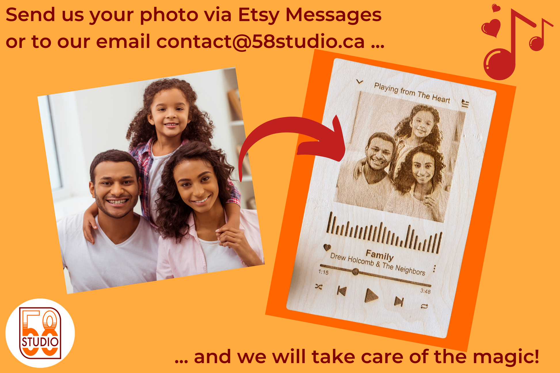 Give us your favorite song and a photo and we will create this beautiful wooden musical-themed portrait plaque, engraved with your photo, as well as song name and artist in a music player style design. Made in high-quality 1/8" Baltic Birch plywood, and carefully laser engraved with a high level of detail, this plaque makes for a perfect personalized gift to yourself or to your loved ones. Celebrate memories and the way we connect through music. Use the two stand feet (included) to display your unique and beautiful custom décor on a desk or table, or use wall adhesive mounts (not included) to put it on the wall. Either way, we guarantee it will catch the attention of anyone who looks at it.